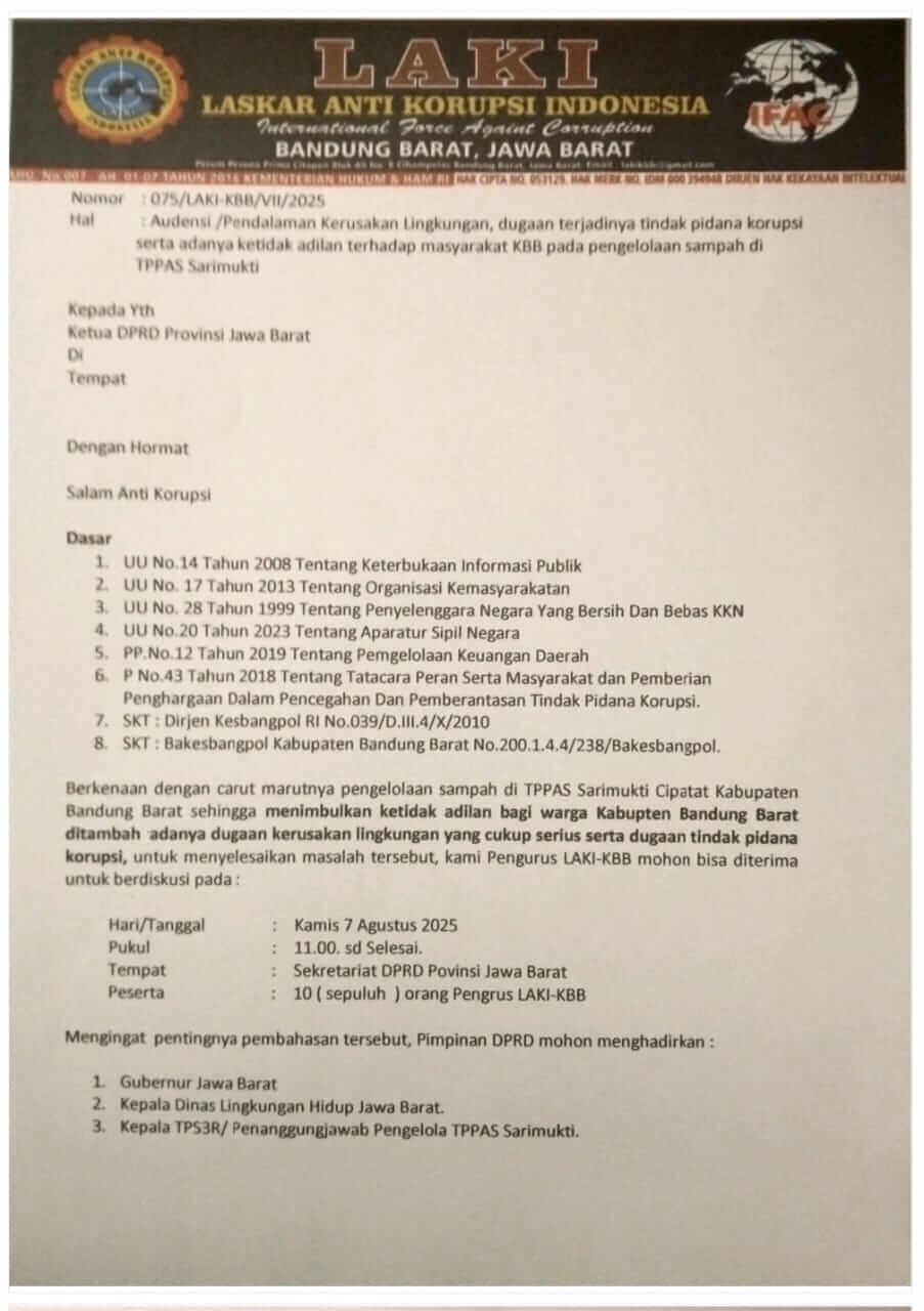 TOPIK MEDIA, KBB – Rencana keinginan audensi Laskar Anti Korupsi Indonesia Kabupaten Bandung Barat/LAKI-KBB Kamis 7 Agustus 2025 bersama Pimpinan DPRD Jawa Barat dengan menghadirkan Gubernur, Kadis LH Jabar dan Kepala TPS3R diduga dinafikkan alasan sibuk.