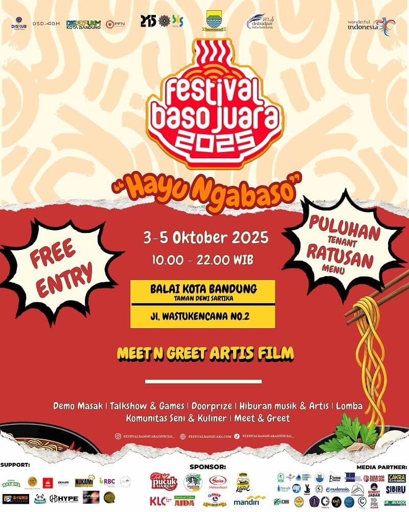 Memasuki penyelenggaraan ke-7, Festival Baso Juara kembali hadir tahun ini pada 3–5 Oktober 2025 di Cikapundung River Spot, Braga, Bandung, mulai pukul 10.00–22.00 WIB. Dengan mengusung tema“Rame Basona, Rame Budayana” dan tagline “Hayu Ngabaso”, festival tahun ini menghadirkan pengalaman kuliner yang lebih meriah.