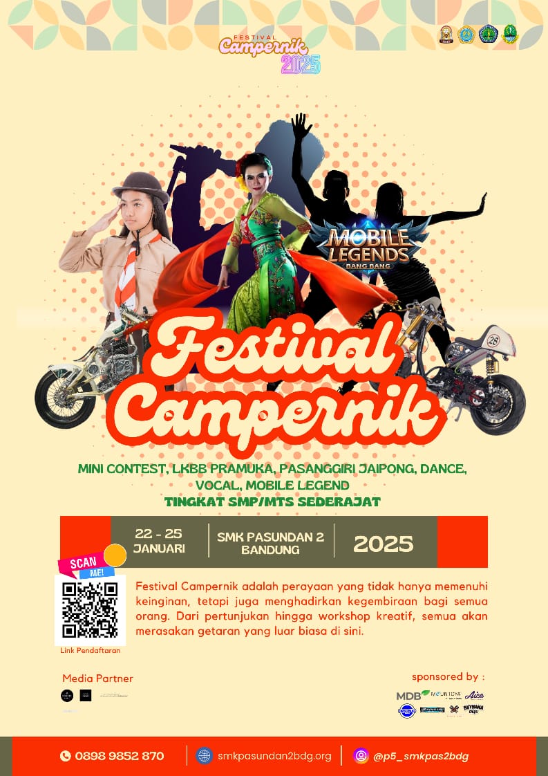Dari istilah tersebut SMK Pasundan 2 Bandung melalui program Projek Penguatan Profil Pelajar Pancasila (P5) bekerja sama dengan P2M menyelenggarakan Festival Campernik 2025, projek ini merupakan pembiasaan untuk mengenalkan tatanan sosial, karya seni, dan budaya yang dituangkan dalam beberapa kegiatan dengan berbasis capaian, prestasi dan teknikal di kampus SMK Pasundan 2 Bandung jl Pelita Karya, 22 – 25 Januari 2025.