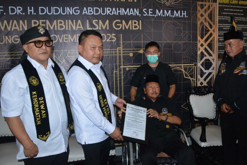 TOPIK MEDIA, KAB. BANDUNG – Jenderal TNI (Purn) Prof. Dr. H. Dudung Abdurahman, SE., MM., MH selaku Penasehat Khusus Presiden Bidang Ketahanan Nasional, resmi dilantik sebagai Ketua Dewan Pembina LSM GMBI. Pelantikan dilaksanakan di Markas Besar DPP LSM GMBI, Padepokan Al Fauzan, Kelurahan Cibeunying, Kecamatan Cimenyan, Kabupaten Bandung. Rabu, 26 November 2025.