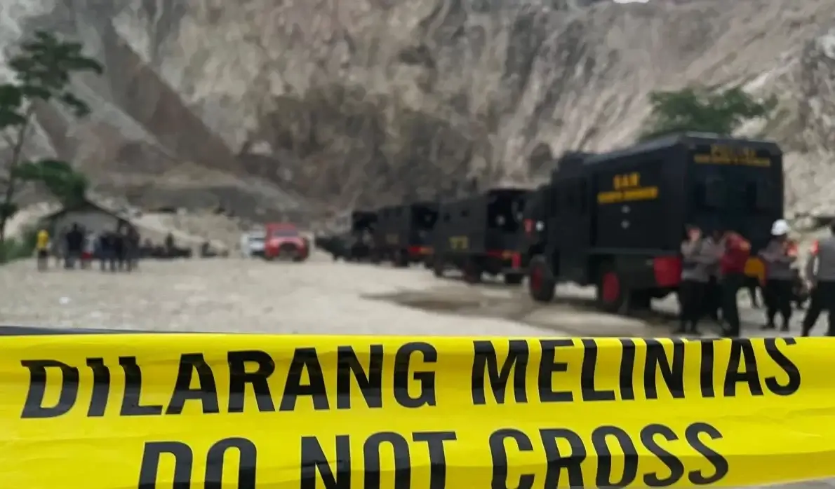 Garis polisi yang terpasang di area kejadian longsor di Gunung Kuda Cirebon, Jawa Barat, Jumat (30/5/2025)./ANTARA